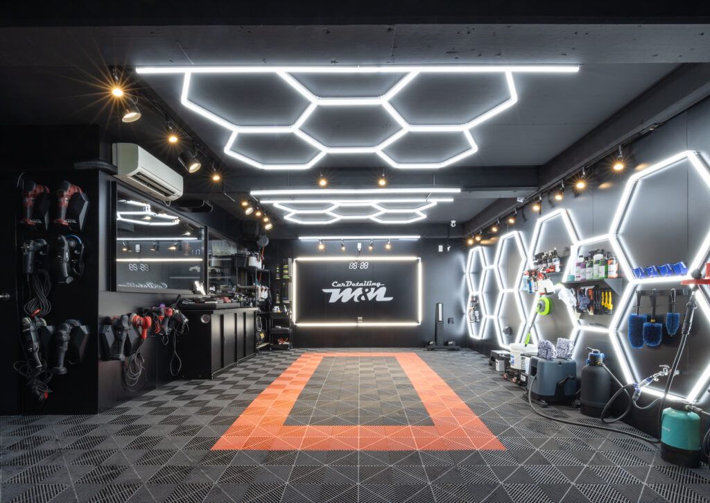 沢山の照明をいろんな角度、種類を利用して車の汚れ傷を見つけてキレイに仕上げます。